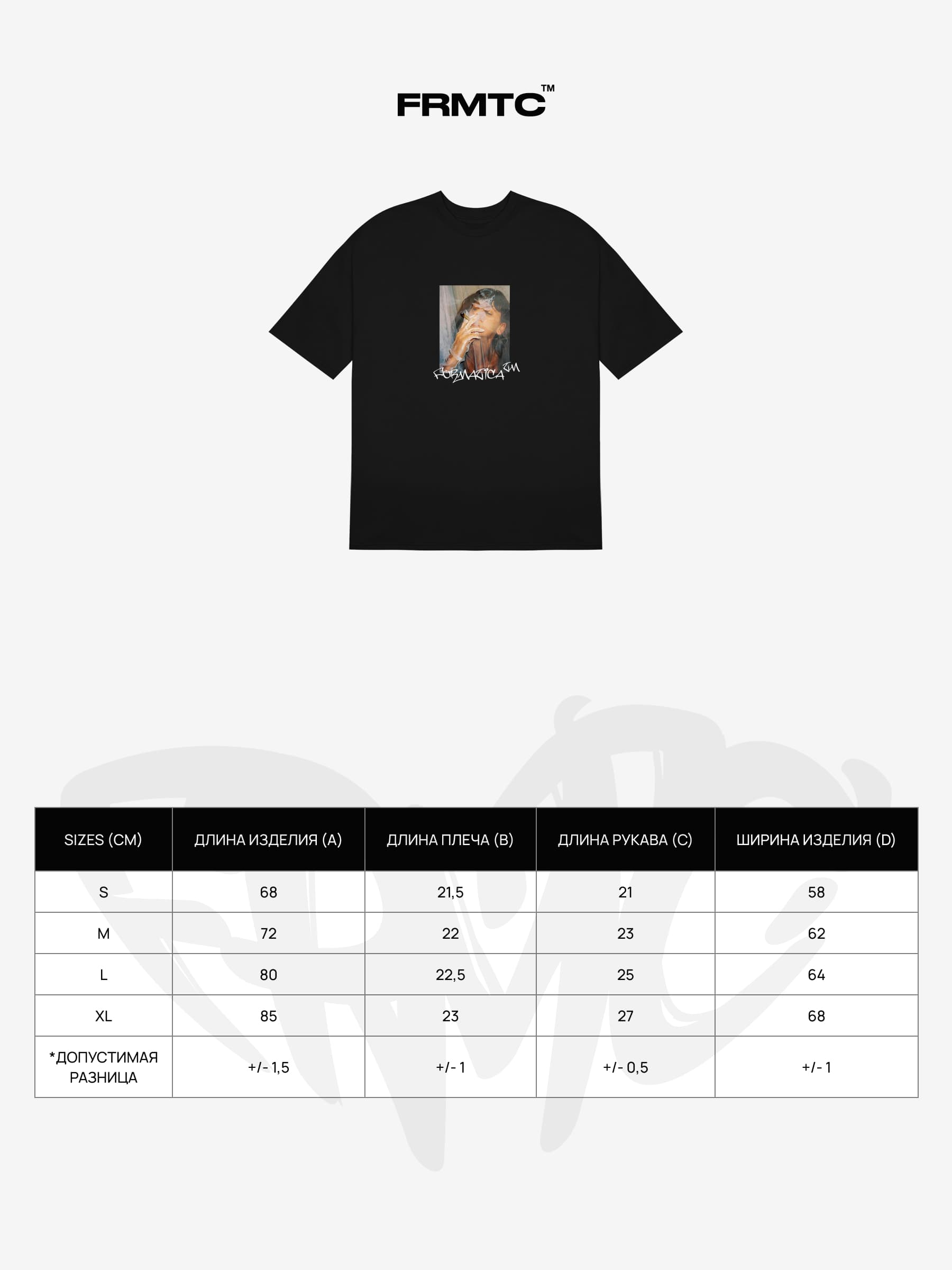 Все футболки у нас в формате oversize. Мы адаптировали лекало под унисекс и подобрали идеальную посадку. На примере размер черной футболки в размере М (смотри фото).
